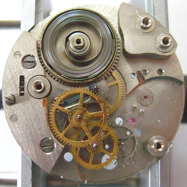 Such a construction with (rocking bar) winding mechanism on the dial side and click mechanism on the movement side is an odd rarity.