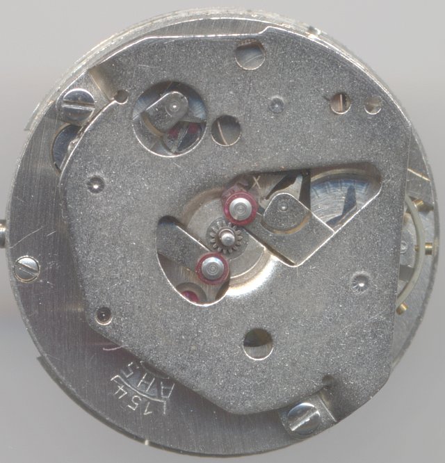 The AHS 154 uses a rocking bar winding system with the click mechanism located on the movement side.