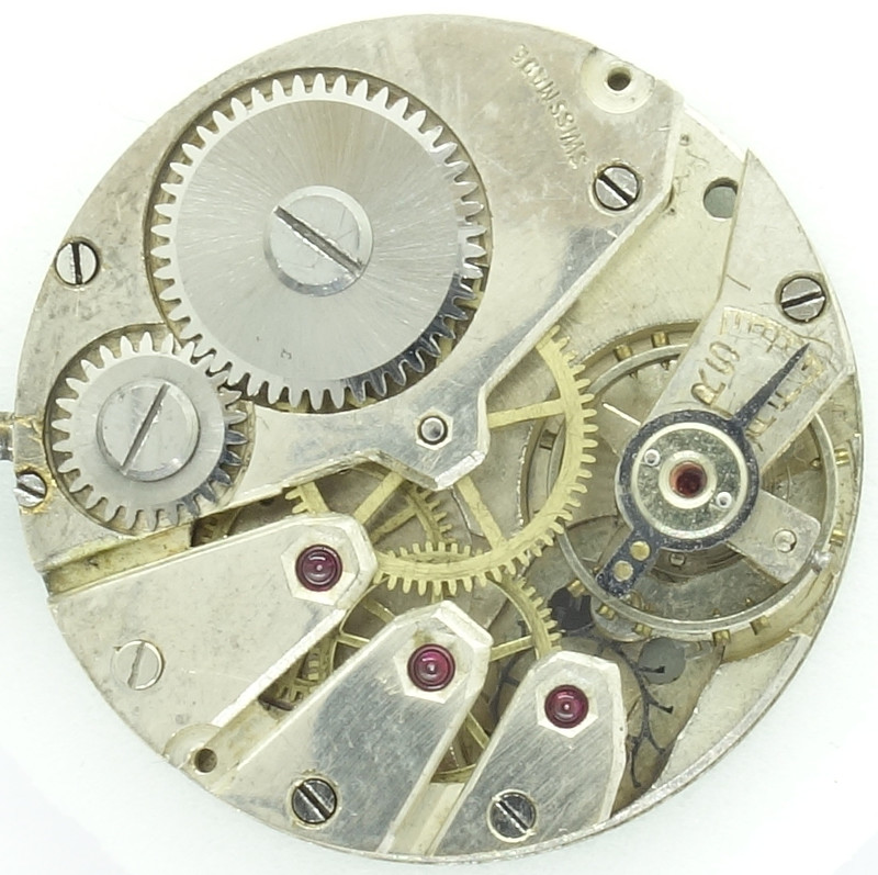 The of course not yet shock protected monometallic screw balance beats with 18000 A/h, can be adjusted by a long regulator arm and works on a conventional swiss pallet lever escapement.