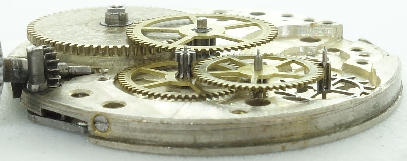 After all: The gear train is exactly, what you can expect for fair to good pallet lever movement: The mainspring barrel drives the central minute wheel, followed by third wheel, seconds wheel at 6 o’clock and finally the steel escape wheel.