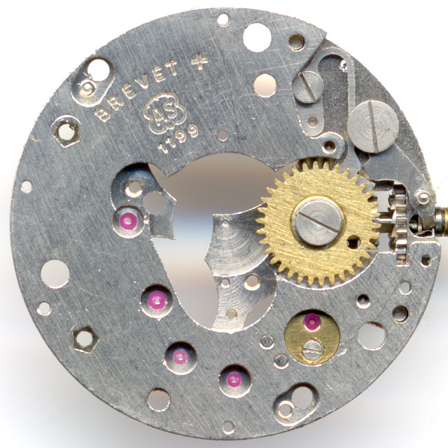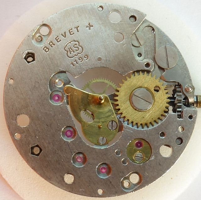 The AS 1199 shown here is a high class pin lever movement, which actually did not exist. Why? It’s because in the literature, there exists only an EB 1199, which the note, that AS pin lever movements were produced by the Ebauches Bettlach (EB). The reason for that is, that (probably in the 1930ies) , there was a specialization within the Ebauches SA with the result, that pin lever movements, which were formerly produced by the AS, from then on were produced by the Ebauches Bettlach.