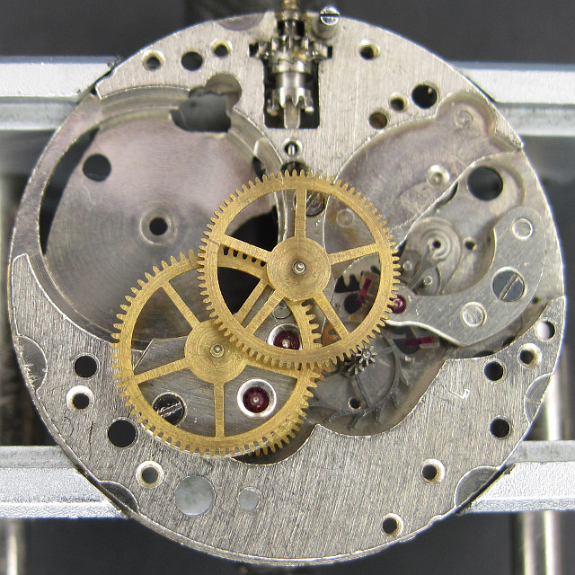 … there are two transmission gears, followed by the second wheel, which is driven by the mainspring barrel. The construction seems to misfit here and also the optics doesn’t match. You might think, that this originally belongs into the transmission of a selfwinding mechanism.