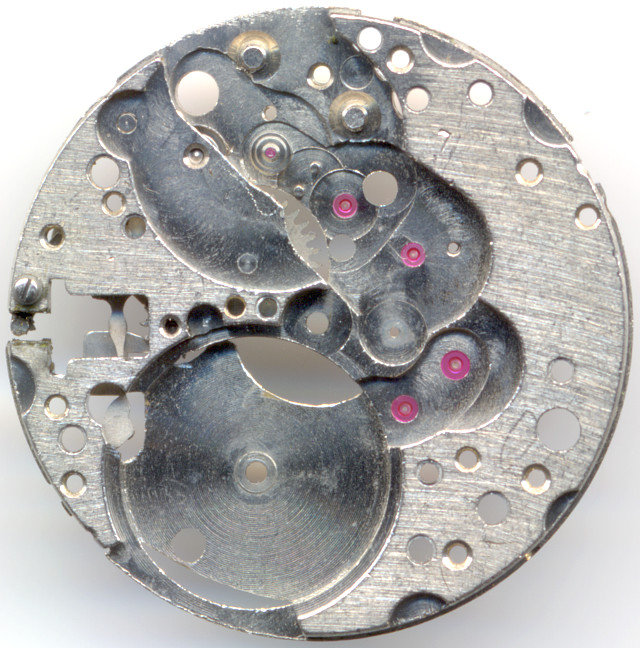 Although the minute pinion is not ruby-beared, the two ruby-beared additional transmission steps lead fo a total of 17 jewels.