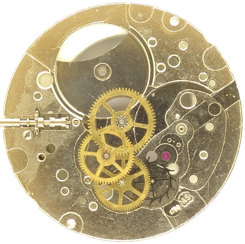 The AS 1759 uses the classical linear gear train with directly driven center minute wheel, third wheel, seconds wheel at 6 o’clock (here without prolonged axle for a seconds hand) and filigree steel escape wheel.