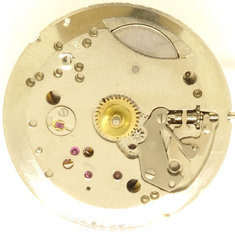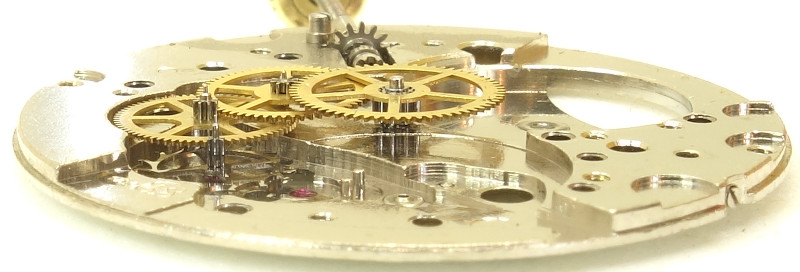 The base plate shows, that all important bearings contain rubies. Only the minute wheel on the dial side, and the barrel on both sides are only meal beared, but since they rotate so slowly, that’s not a real disadvantage.