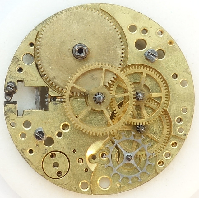 The AS 568 uses the standard gear train for a cylinder movement: Mainspring barrel, directly driven center minute wheel, third wheel, fourth wheel and finally the cylinder wheel.