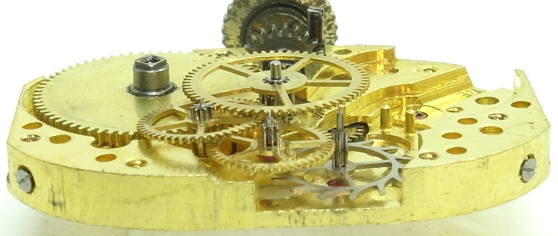 The gear train construction is typical for this kind of form movements: The mainspring barrel drives the center minute wheel, followed by the two small third- and seconds wheels, and finally the again normally-sized escape wheel for the pallet lever escapement.