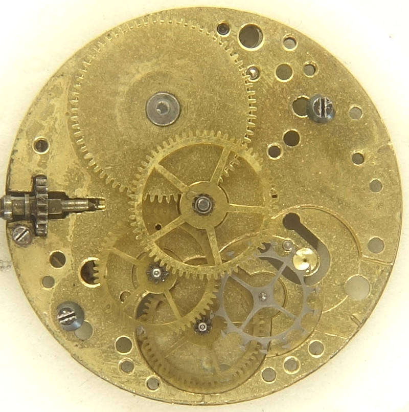 This cylinder movement, probably from the 1920s, has got a diameter of 9 3/4 lignes. Although the shape of its three-quarter bridge is pretty unique and although parts of the movement number can be seen on the dial side, it cannot be identified.