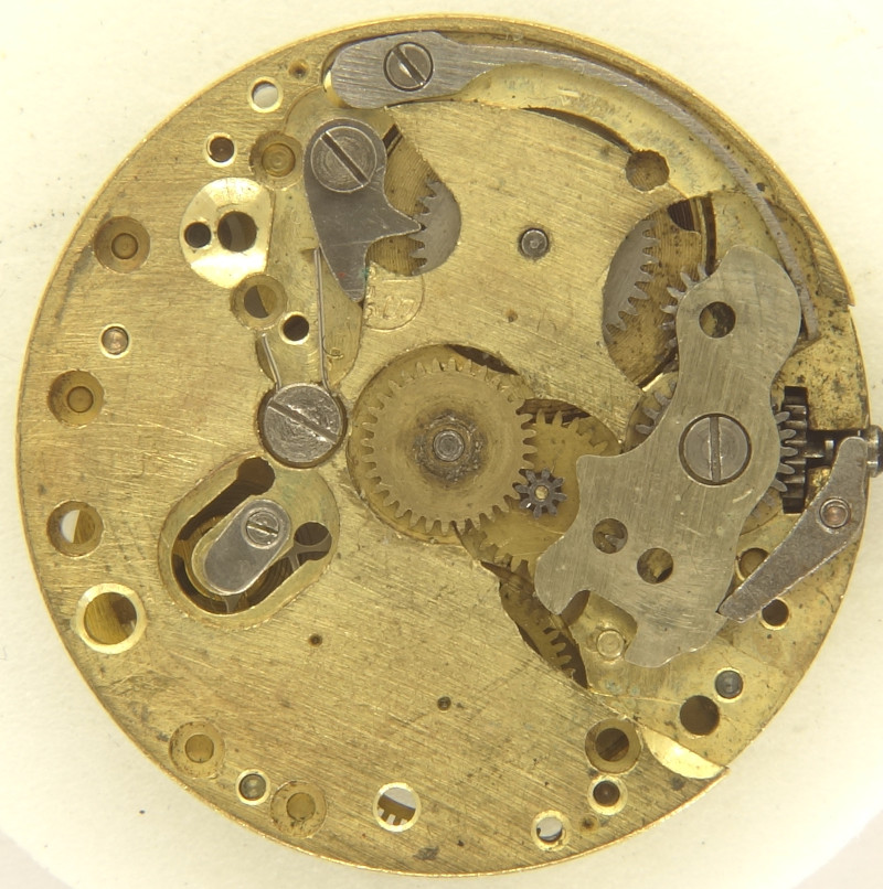 The base plate already shows, that it is a pretty simple movement. It has got no jewel bearings at all on the base plate, and the depthing of the cylinder of the balance can be achieved by bending(!) the U-shaped cutout around the balance wheel bearing.