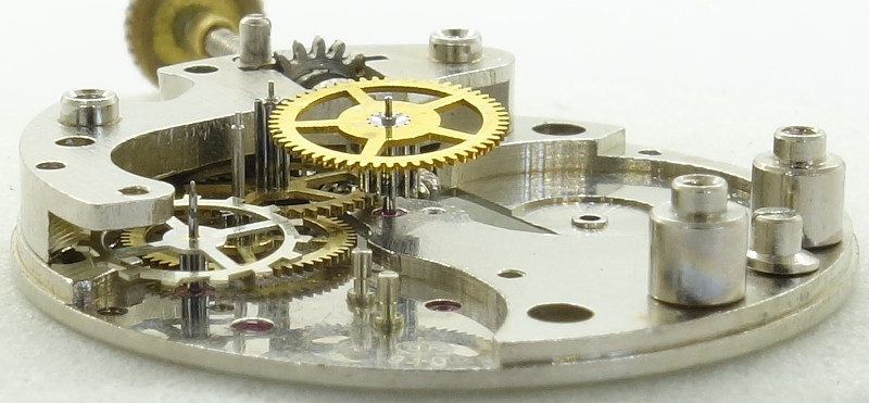 If you look exactly, you see, that below the center hands tube, thus located decentally, there’s the second wheel, but no conventional center minute wheel.