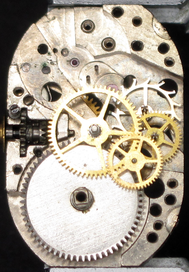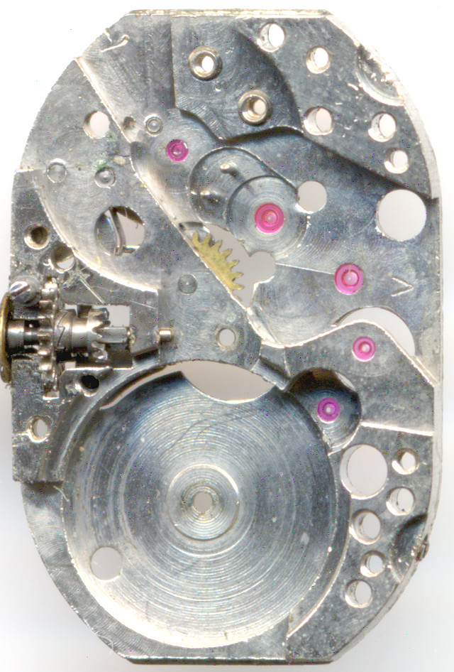 The base plate is massive and has got the typical construction of small form movement where the gears and bearings partially overlap each other.