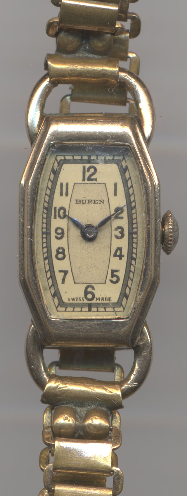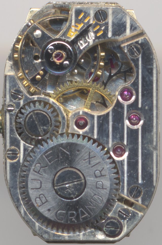 This “Grand Prix” movement from Buren is a pretty old form movement, probably from the 1930ies. It’s high quality can be seen on the stripes decoration and on the bimetal balance with screws. Bimetal balances were not often used in tiny ladies’ movements. They reduce the running errors, which occur due to temperature changes to a minimum.