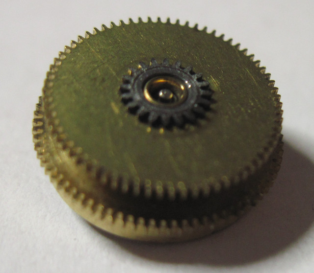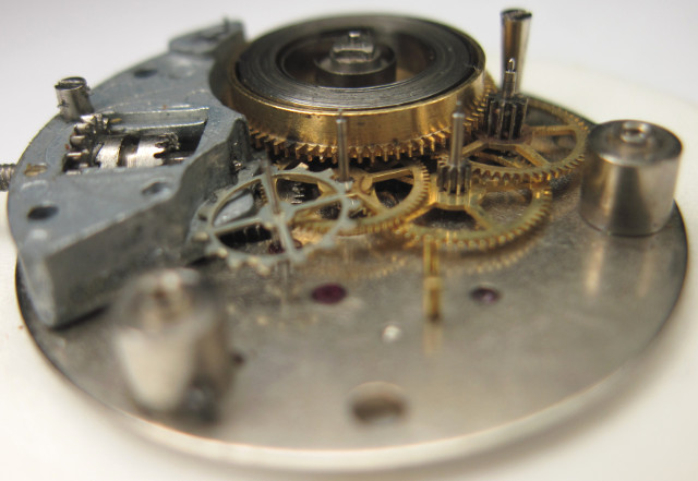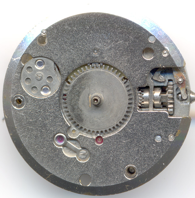 The crown wheel is on the inner side of the top gear plate, under which no less than four gears and the mainspring barrel are beared: