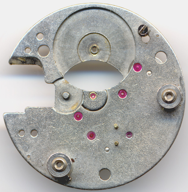 The base plate of this Roskopf-type pillar construction shows full usage of jewel bearings - this it not ubiquotous on pin lever movements.