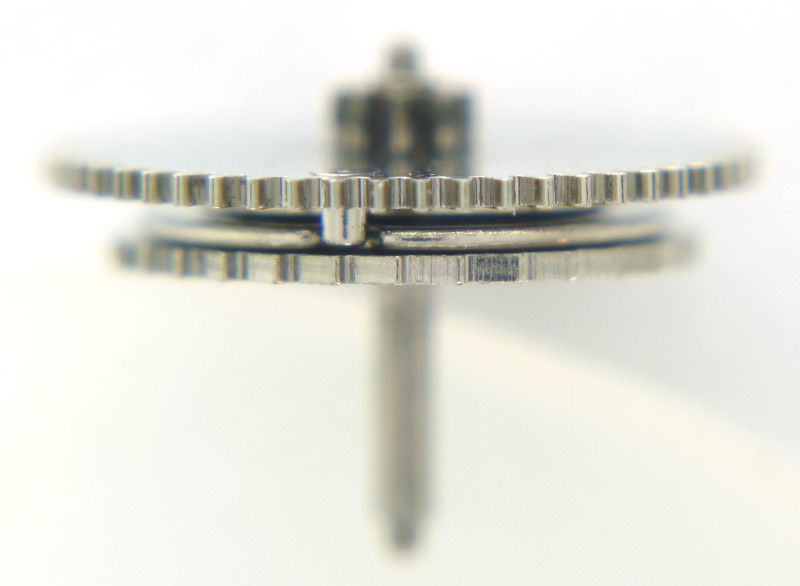 The gear train for the selfwinding mechanism consists of only two parts, a reduction gear and a clutch wheel.