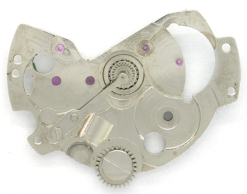 The base plate is very crude executed, but has synthetic rubies at all important bearings. These rubies are all flat and therefore have little ability to retain oil.