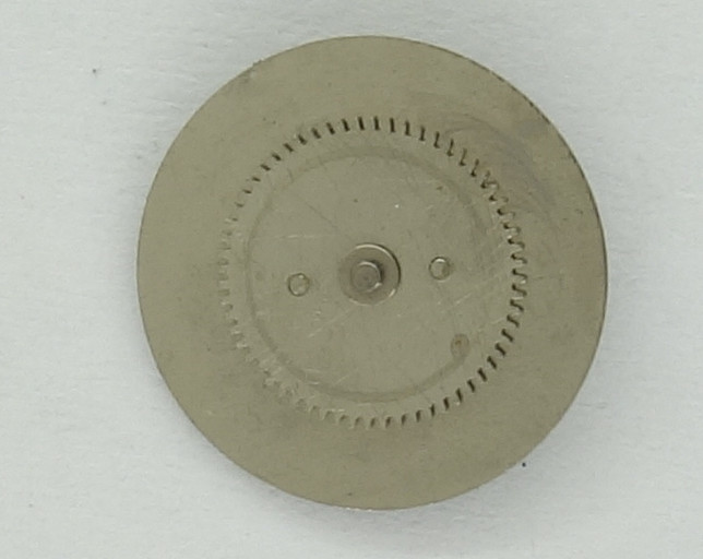 The calendar mechanism is constructed in an odd way: Two gears with more or less long or partially missing teeth and a spring ensure, that the date advances slowly between 23:20 and midnight and can be corrected by turning the hand back and forth.