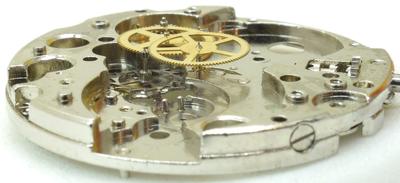 Unlike the very simple china movement, here a gear train with indirectly driven minute wheel is used.