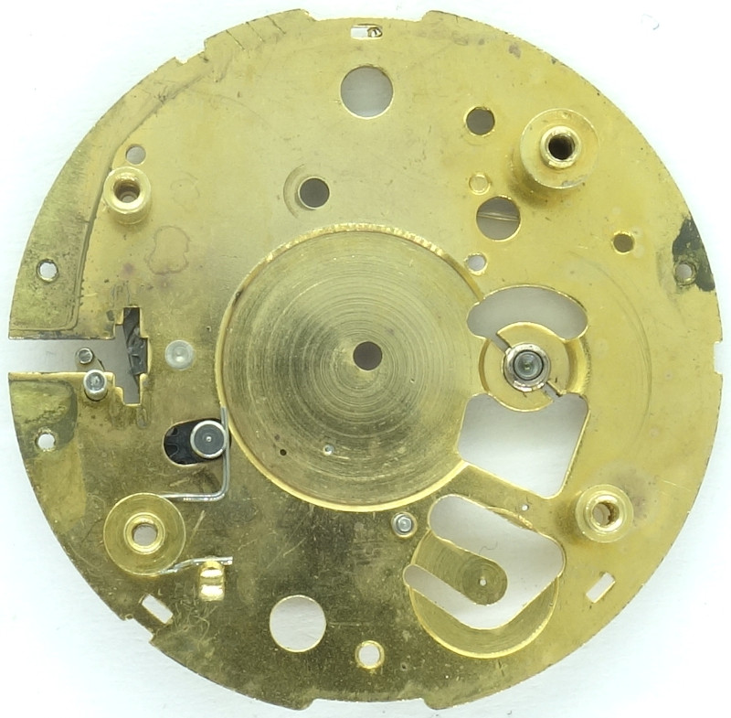 The execution of this zero-jewel pillar movement is ugly and crude, even the deepening for the center minute wheel is excentrical, which gives that plate an odd look.