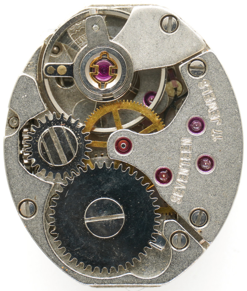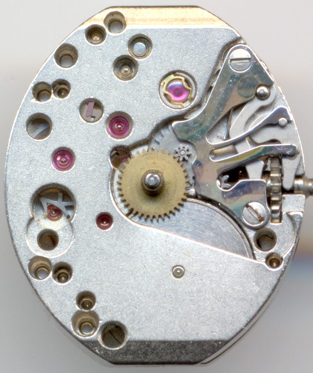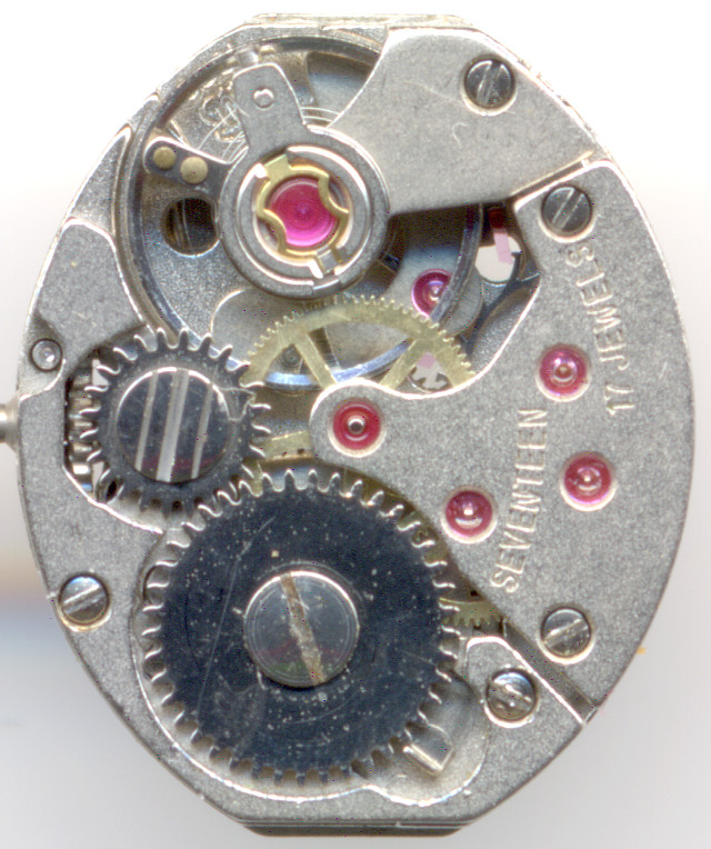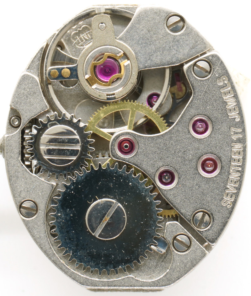 All bearings, except those of the slowly revolving mainspring barrel contain rubies, even the directly driven center minute wheel. On such a tiny movement, it is important to reduce friction as much as possible.