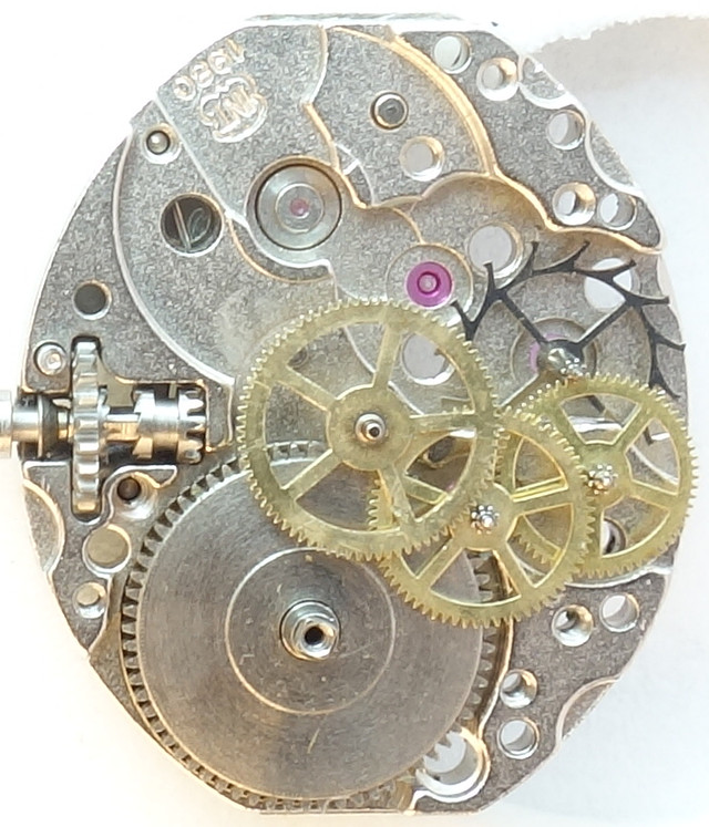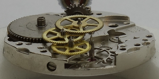 Due to the lack of space, the gear train is very stocky, in the area of the escapement wheel even two-storey. The lower bearing of the seconds wheel is not on the base plate, but above the escapement wheel. In the following photo, you can observe this: