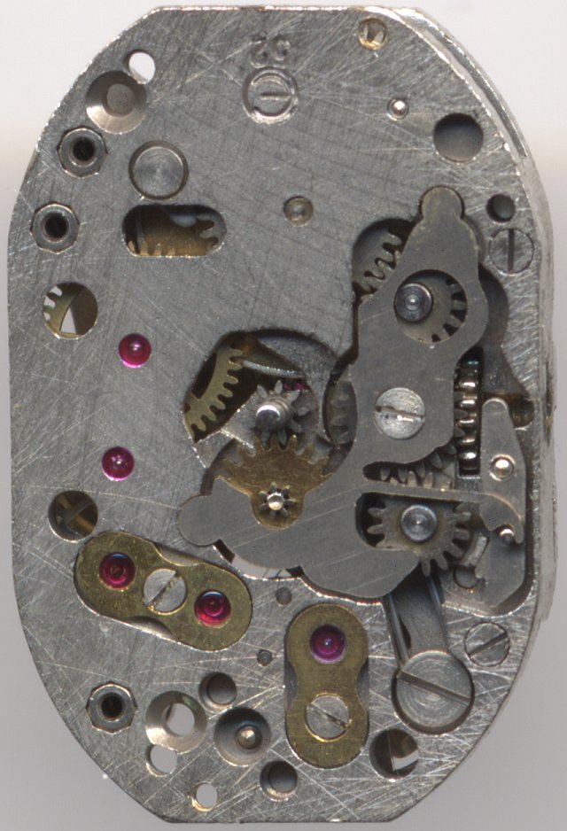 As usual on cheaper movements, the winding mechanism is on the dial side and is only a rocking bar mechanism. This is not very service-friendly, but cheap in production.