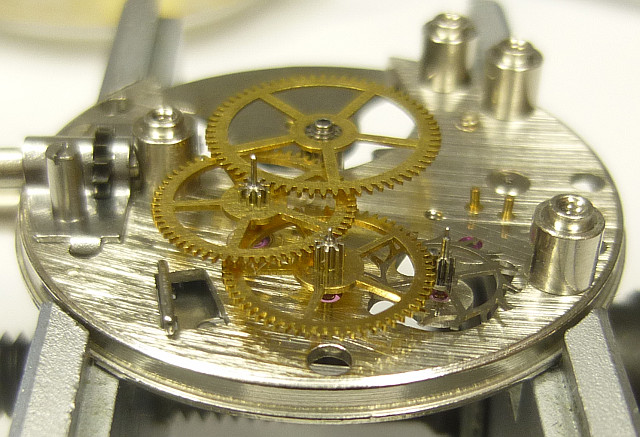 Since the minute wheel is double ruby beared (the top, detachable, ruby is also the bearing for the indirectly driven center second, which is only beared on that side, and which is secured a bit by a spring), even without cap jewels, this movement has got 17 jewels.