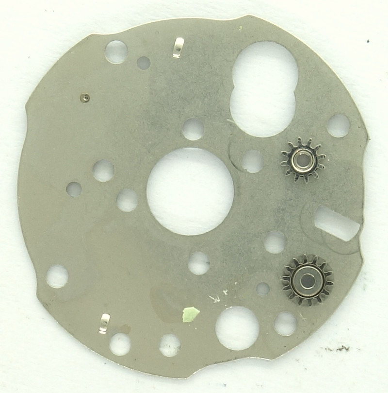 The calendar mechanism is covered with a plate, under which the two gears of the correcting mechanism are beared.