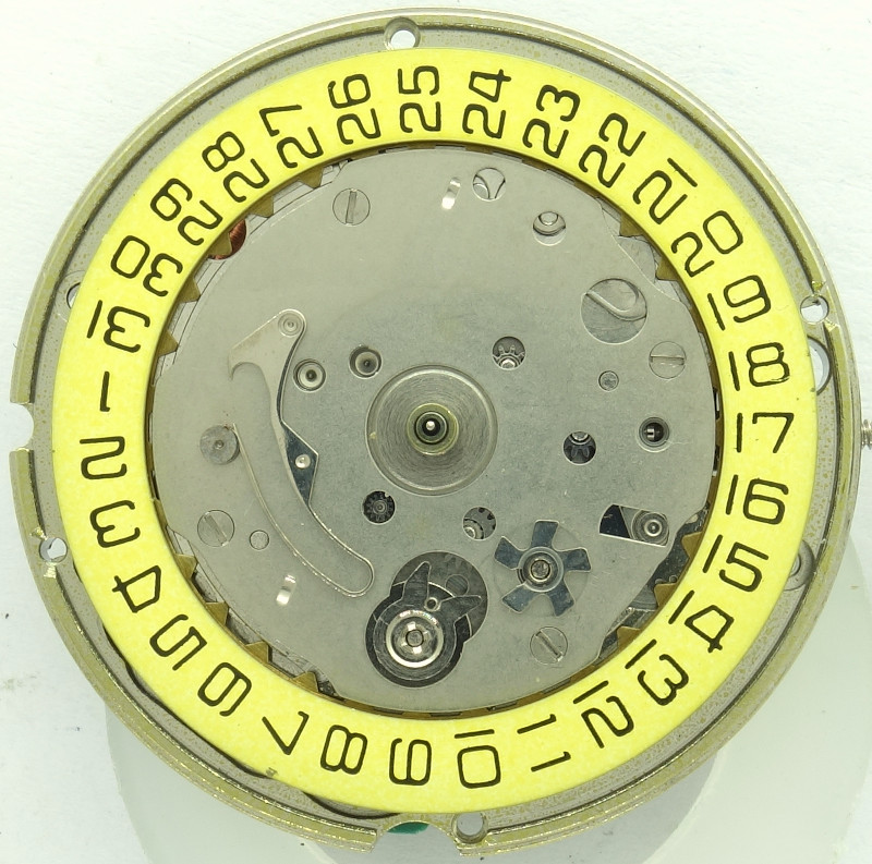 The weekday disc is made in a way, that the weekday is written in full on the outside of the date ring. It has got a star wheel on its lower side, which is used for advancing and holding it in position.