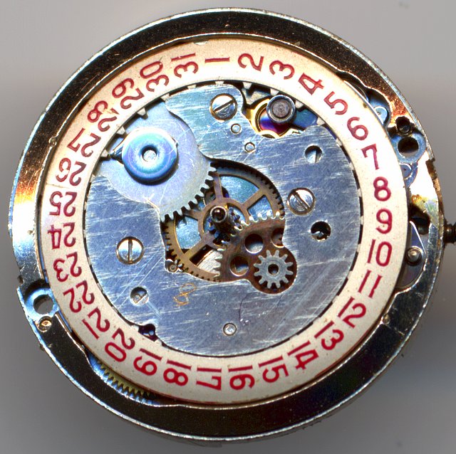 The selfwinding mechanism used the common ETA pawl winding wheels plus two following gears.