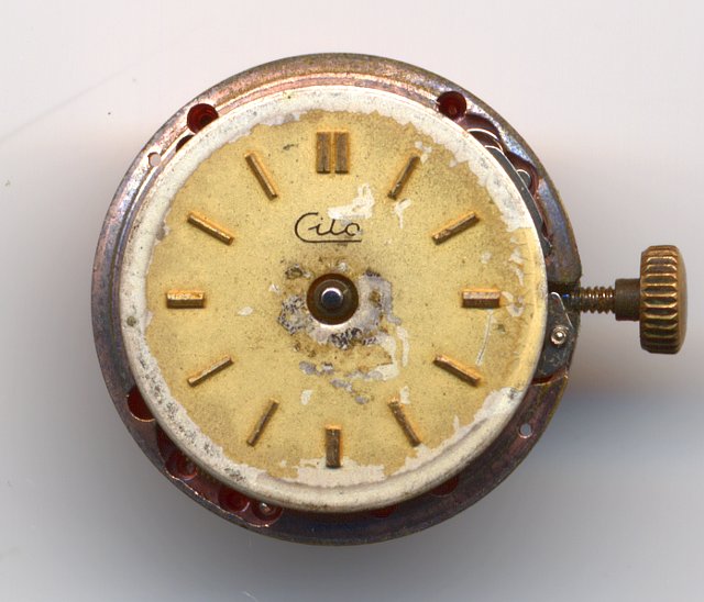 On the dial side, you see the familiar ETA construction with the yoke winding system, the printed minute dial part, the preparations for further cap jewels (on the 17j version) and the non jewel-beared train of the second wheel (at “8”), which drives the minute wheel.