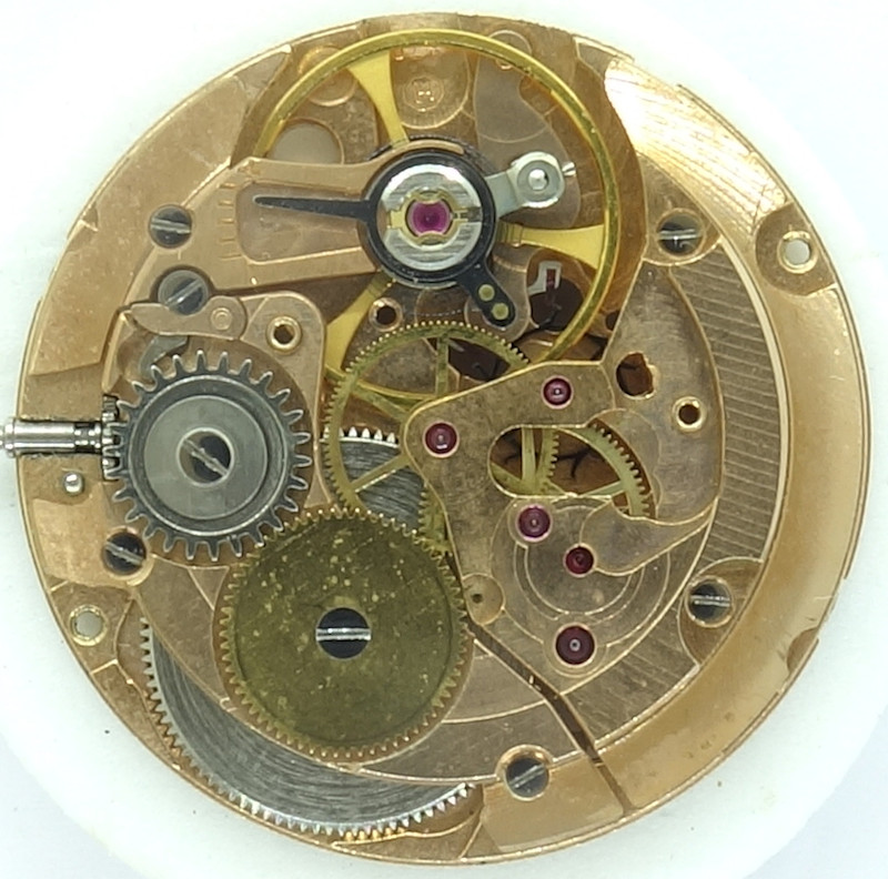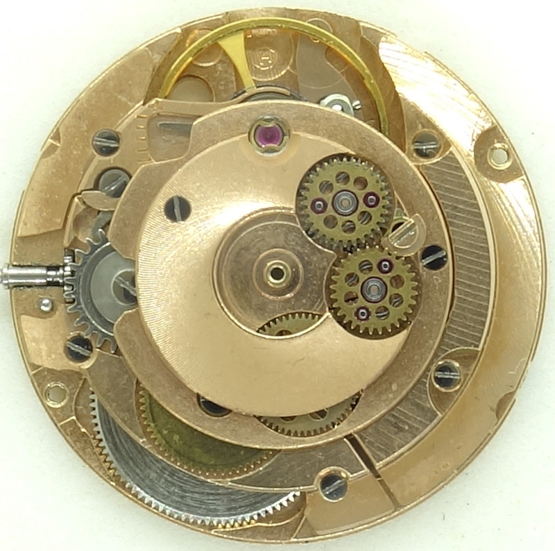 The contemporarily very modern gear train is used by ETA until today in their movements: Mainspring barrel, second wheel, third wheel, directly driven center seconds wheel and finally the escape wheel.
