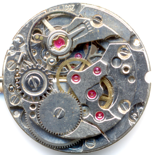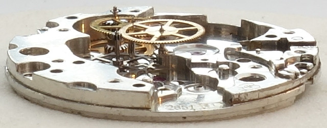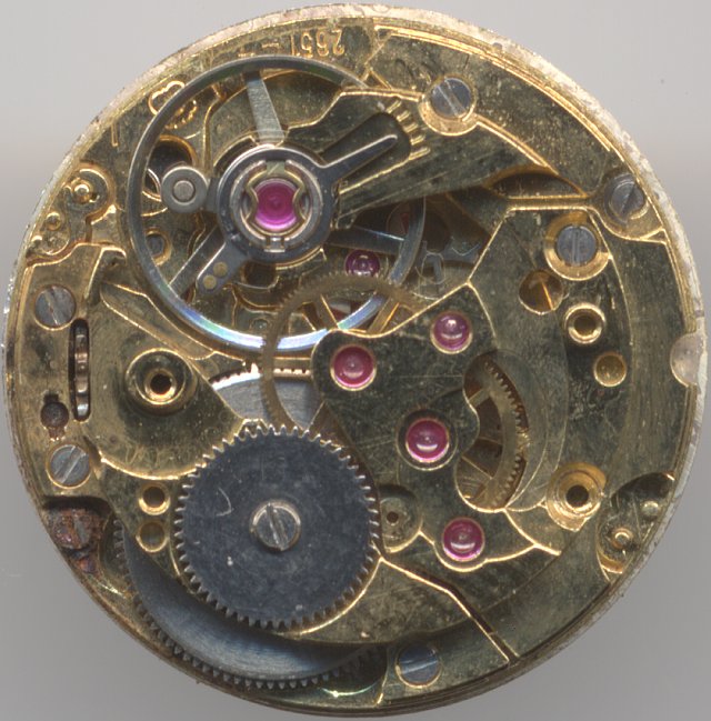 As on all better movements, all important bearing contain synthetic rubies, except for the bearing of the center second. Additionally, the mainspring barrel is ruby-beared on the dial side.