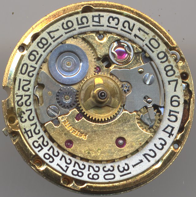 This movement has also got a quickset mechanism: On the middle crown position, the tiny switching wheel at 4 o’clock enages with the moveable setting wheel, which is now released from the engagement with the changer wheel. The three fixed switch fingers advance the date ring.
