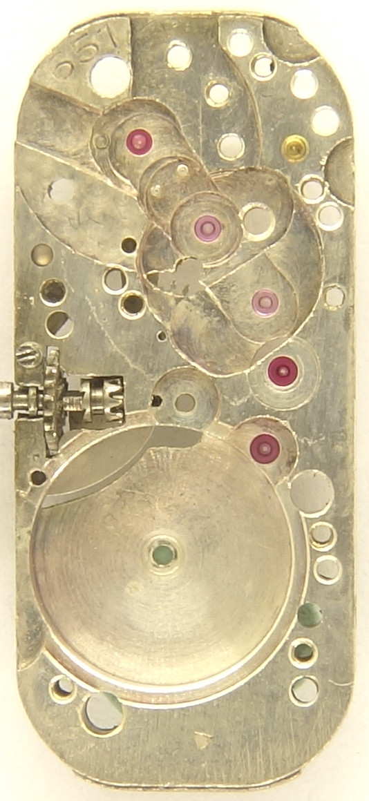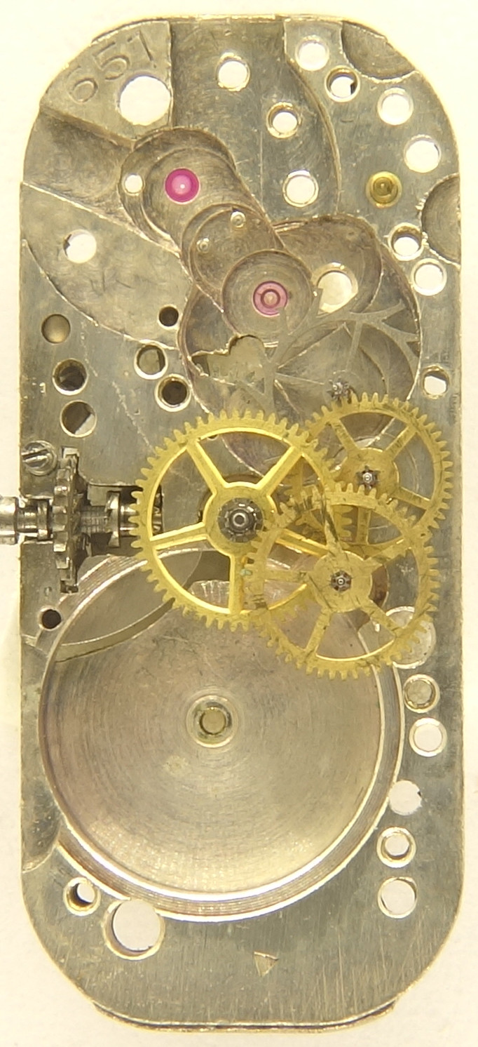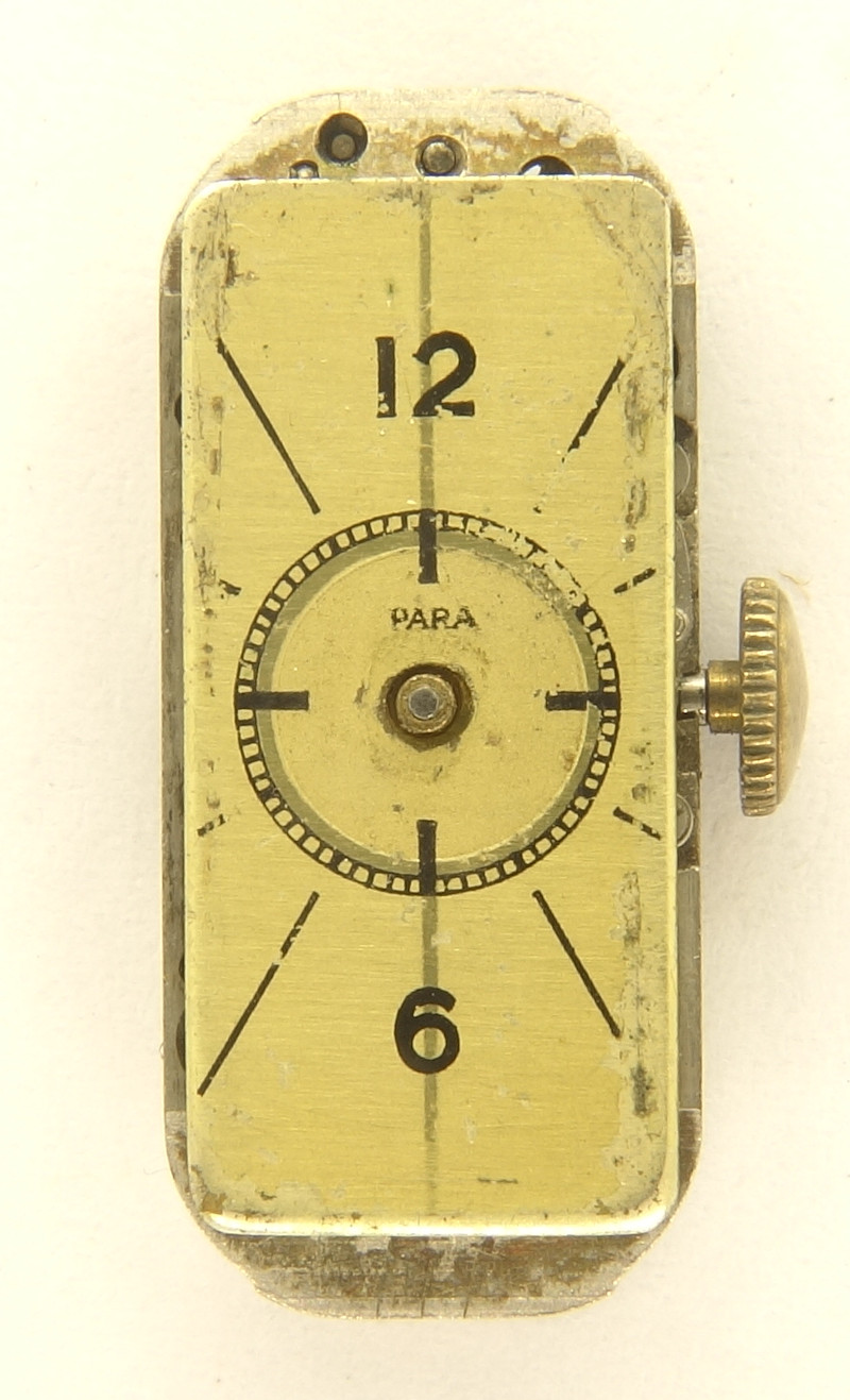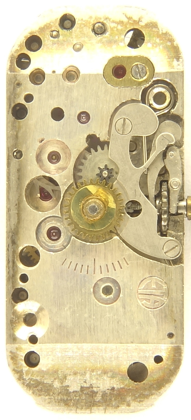 From the 1930s dates this extremly shaped ladies’ watch movement, which is only 10.2mm (4 1/4 lignes) small, but 22.8mm (10 lignes) long.