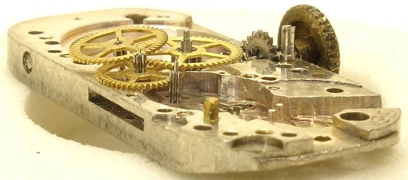 We have the classical gear train here, with directly driven center minute wheel, followed by the rather small third and fourth wheel and finally the steel escape wheel.