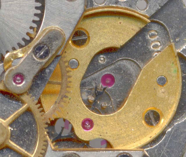 The construction of this movement is strictly classical - The minute wheel is directly driven by the mainspring, and the fourth wheel at position “6” could carry the decentral second hand - but not on the ETA 932, where the third wheel drives the center second hand. To avoid a jumping second hand, a very flat spring is used at the bottom of the center second hand train.