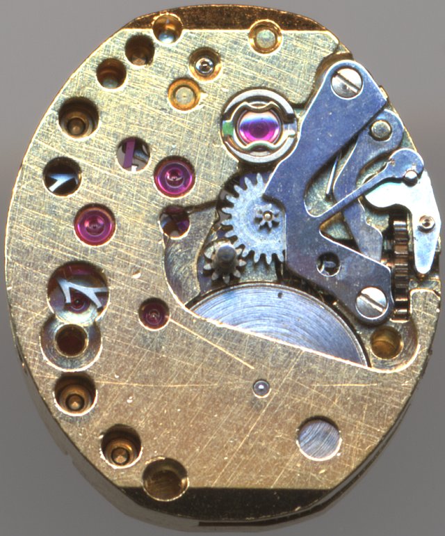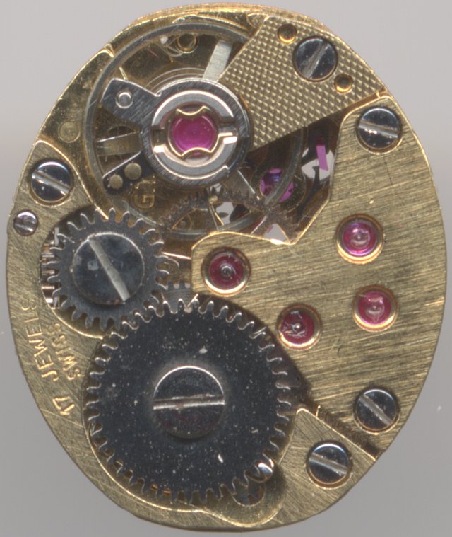 This is a ladies’ form movement, 5 3/4 x 7 lignes. It is marked as “74E4” and has got a “Swiss” marking, indicating, that at least parts (like the Incabloc shock protection) were made in Switzerland.