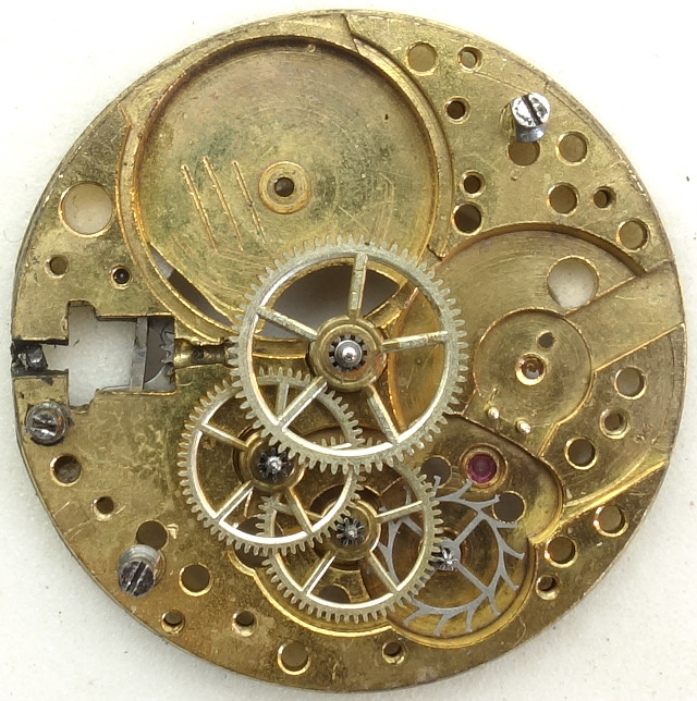 All important bearings contain synthetic rubies, in total uses this movement 15 jewels, the maximum of that time.