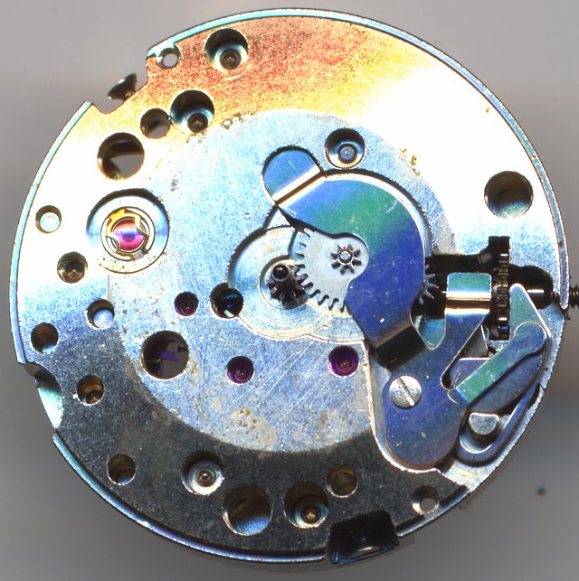 In the seventies, the FHF 37 was released as a movement of their late period. You see on this movement, that it was designed with cost reduction in mind, by looking at the “hammer-nail decoration” (or non-decoration) of the plates or the very large yoke spring, which also keeps the minute wheel in position.