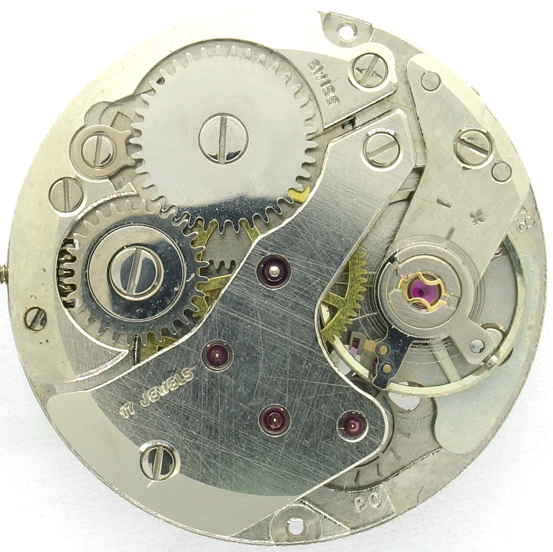 The three-leg, electronically balanced anular balance shows the design, which is still used today. It is of course shock-protected (Incabloc) and beats already semi-fast with 21600 A/h, which can be adjusted at the hairspring key only.