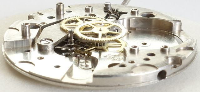 The gear train consists of a center minute wheel, followed by the third wheel, center seconds wheel and finally the escape wheel.