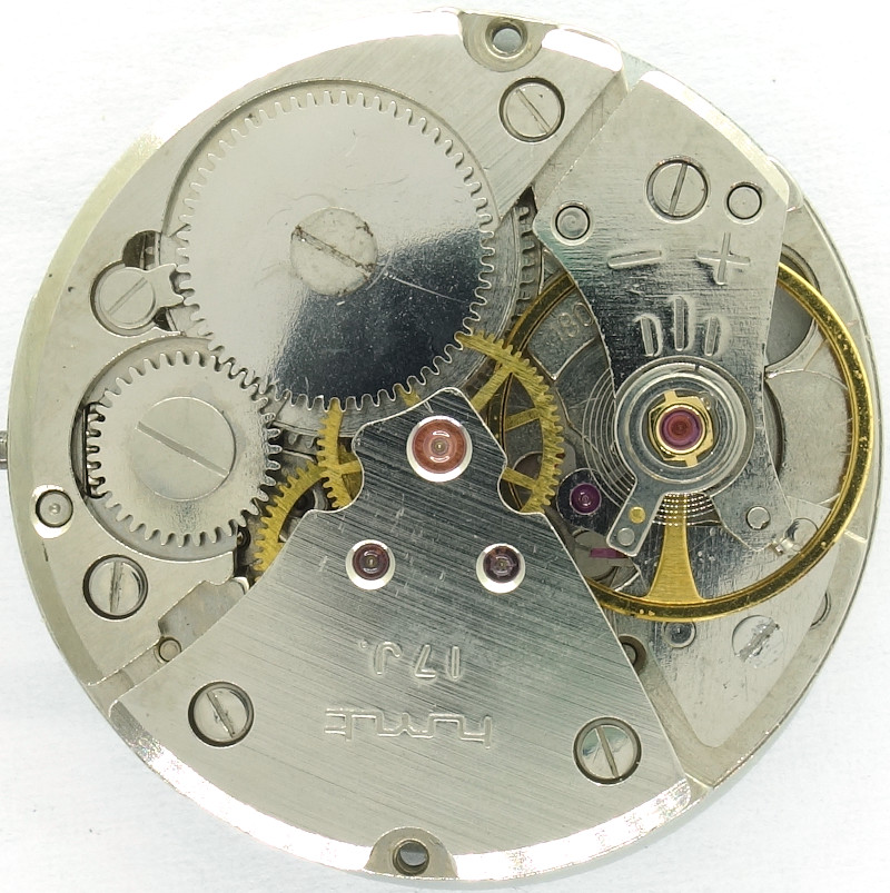 All important bearings are equipped with jewels, and even the minute wheel runs in a jewel-bearing, thus leading to a total of 17 jewels.