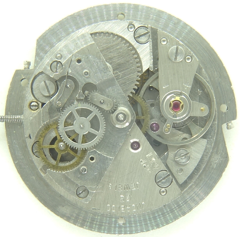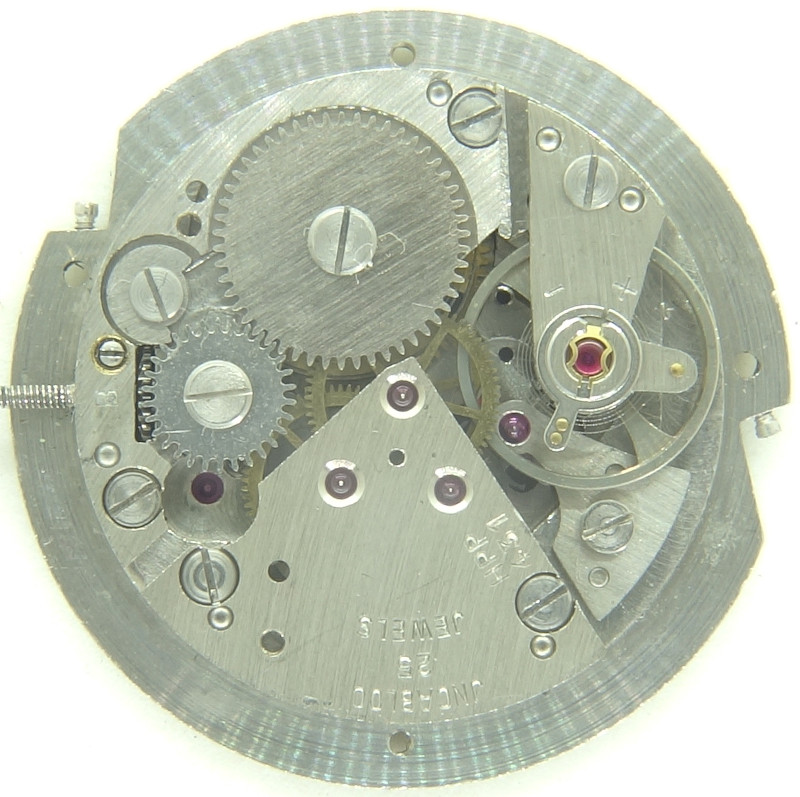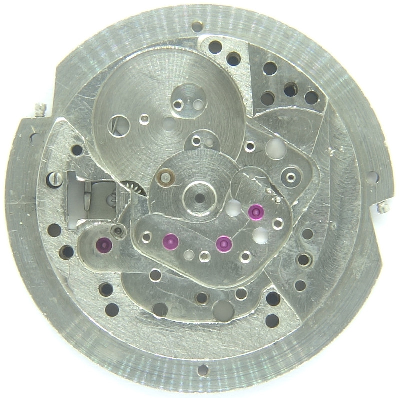 The selfwinding mechanism is implemented in an detachable module. If it is not mounted, only the bearing besides the crown wheel reveals, that it is not a windup movement.