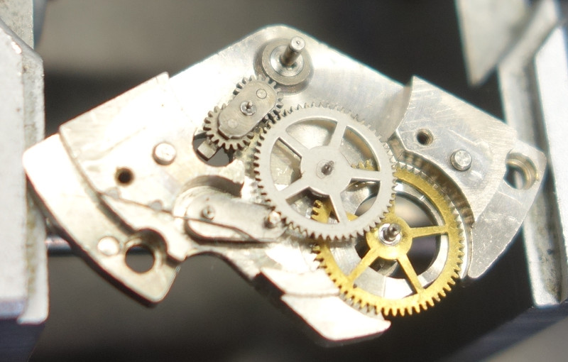 When only the base plate of the selfwinding module is mounted, you can see, where the engagement with the crown wheel will happen.