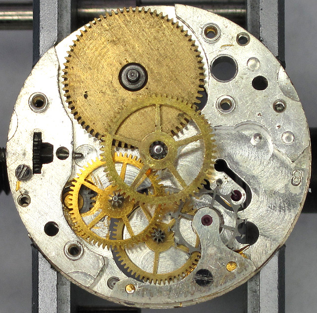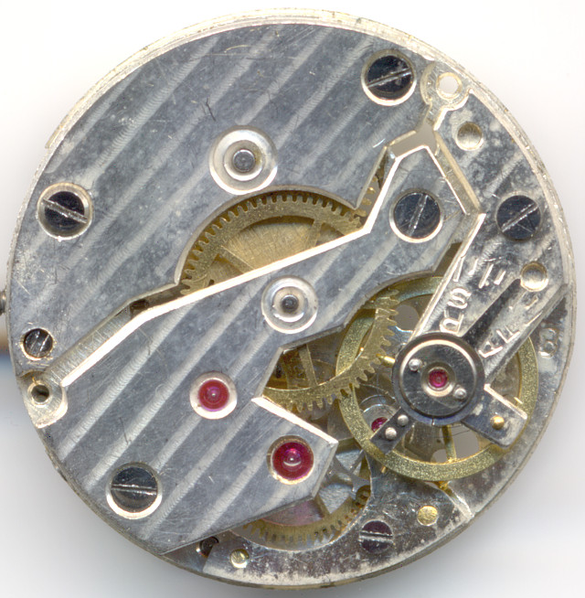 The gear train is typical for a cylinder movement: The non shock-protected annular balance beats slowly with 18000 A/h, and its cylinder controls the flat cylinder wheel with its sharp teeth, which is located beyond an own cock.