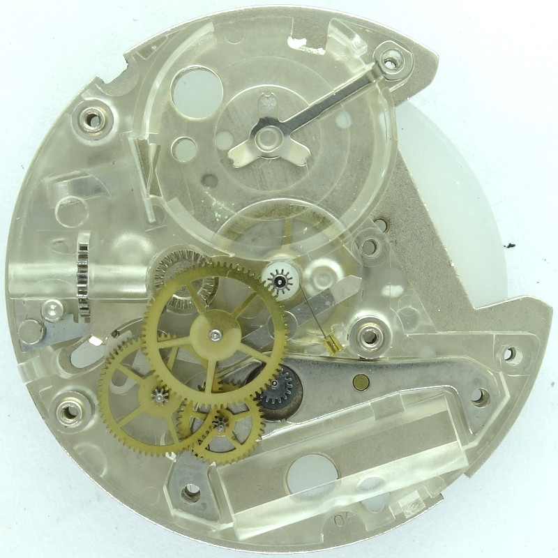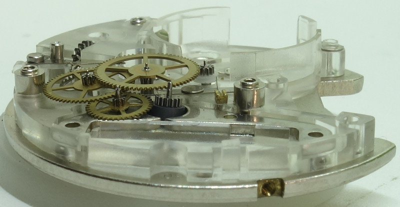 The gear train itself remained the same and consists of the center minute wheel, which is beared below the plastic container, the third wheel, seconds wheel, reduction wheel and finally the rotor.