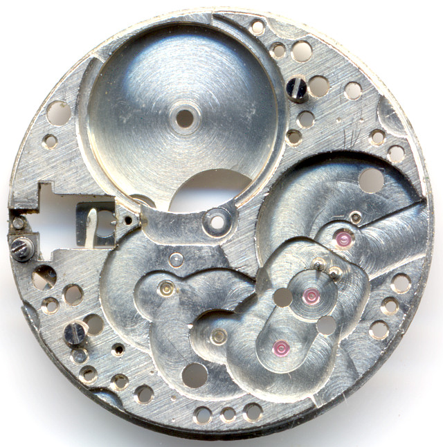 The most notable part of the dial side of the Junghans J80/1 is the setting lever spring with its almost rectangular end part. The rest of the dial side looks absolutely standard.
