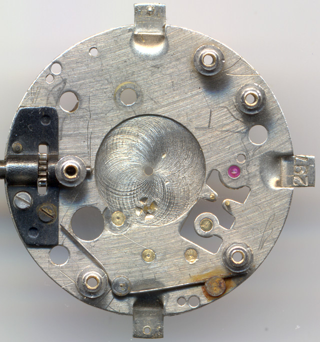 On the dial side you can see the rocking bar winding mechanism and the click mechanism, which is located under a black bridge. The click wheel of the mainspring barrel is just stacked, not secured by a screw.