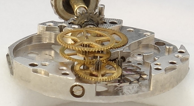 We have the classical gear train here with directly driven center minute wheel, followed by the third wheel, seconds wheel and escape wheel. The third wheel is a double one, the lower gear interferes with the seconds wheel, the upper one drives (no visible in the photo) the center second wheel.